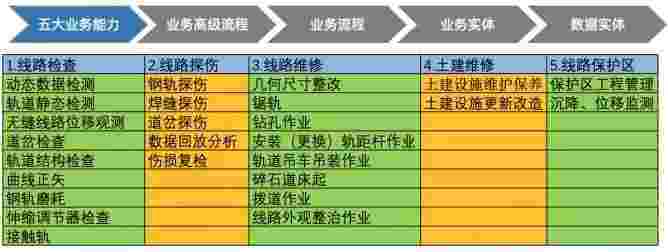 在轨道运维业务中,,,,,,,,,,,我们形成了完整的从业务能力(业务域)-业务流程-业务实体-数据模型的分析梳理过程。。。。。。。。。。轨道运维业务能力如下图所示::::::::