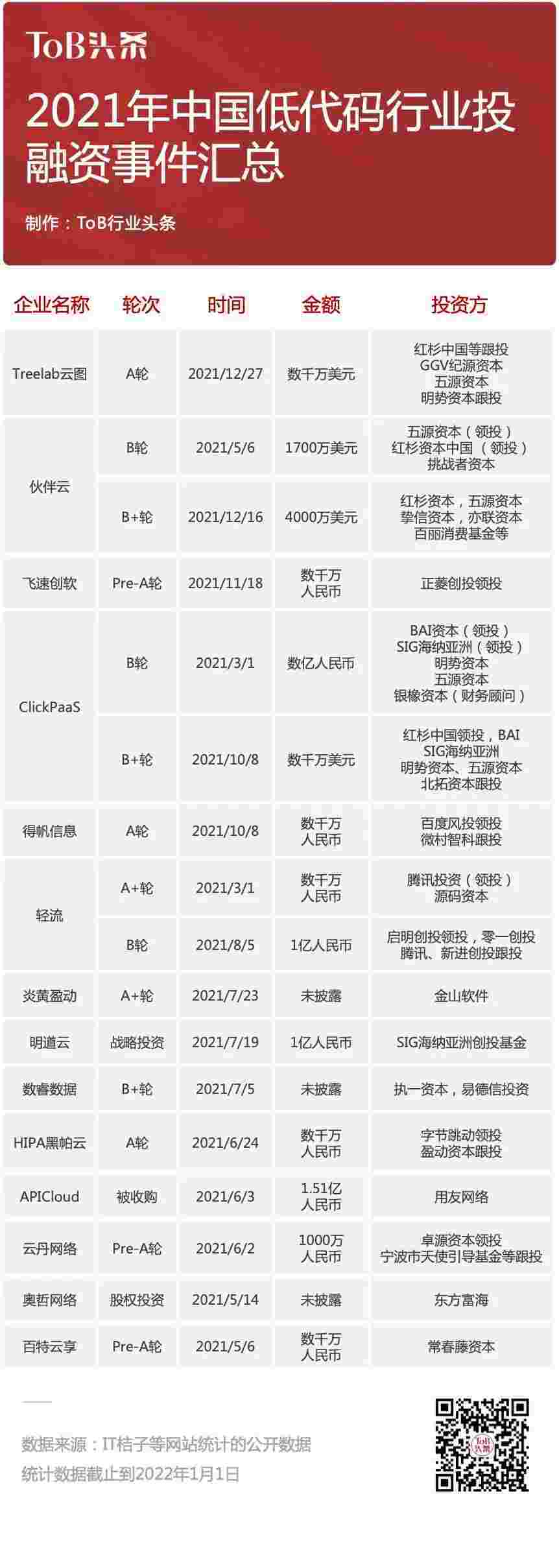 到2021年,,,,,,,,无/低代码投融资规模势头更甚,,,,,其中包括轻流两轮融资(A+轮数千万人民币,,,,,,,,,,,,B轮近亿人民币)、、、、、NO钱包 两轮融资(B轮数亿人民币,,,,B+轮数千万美元)、、、、百特云享数千万元Pre-A轮融资......